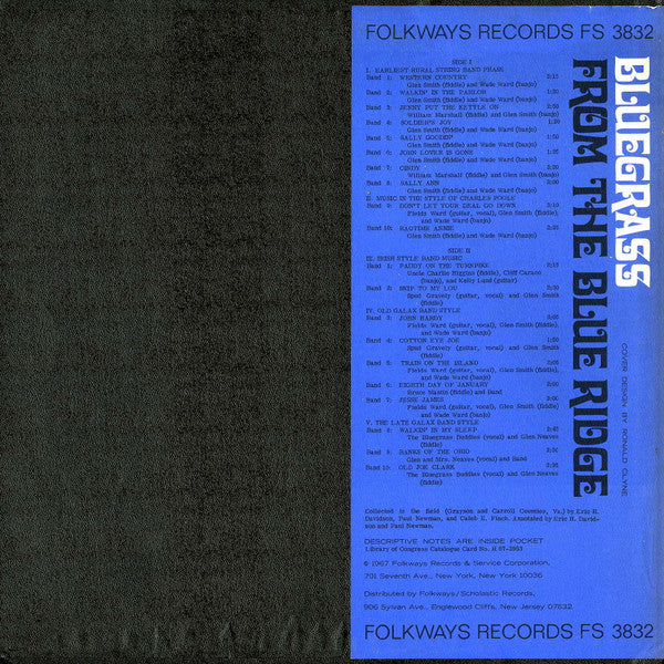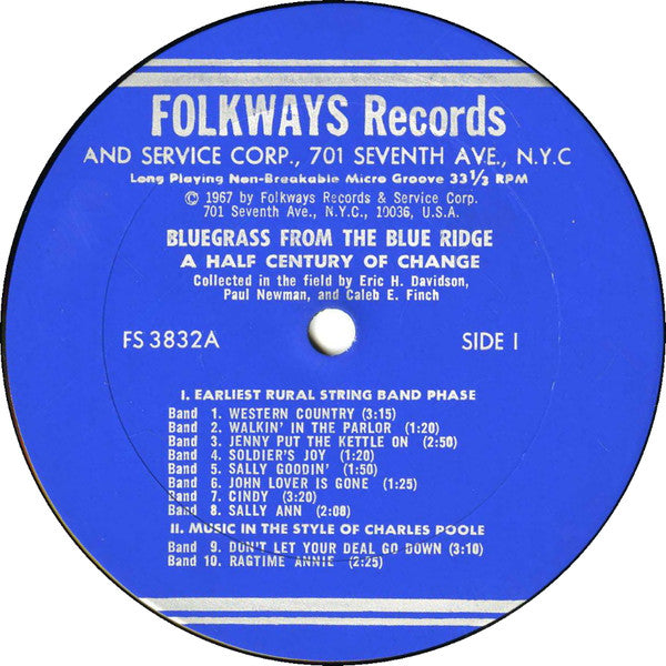 A1. Western Country 3:15 A2. Walkin' In The Parlor 1:20 A3. Jenny Put The Kettle On 2:50 A4. Soldier's Joy 1:20 A5. Sally Goodin' 1:50 A6. John Lover Is Gone 1:25 A7. Cindy 3:20 A8. Sally Ann 2:00 . II. Music In The Style Of Charles Poole A9. Don't Let Your Deal Go Down 3:10 A10. Ragtime Annie 2:25 . III. Irish Style Band Music B1. Paddy On The Turnpike 2:15 B2. Skip To My Lou 2:30 . IV. Old Galax Band Style B3. John Hardy 2:15 B4. Cotton Eye Joe 1:50 B5. Train On The Island 2:05 B6. The Eighth Day Of January 2:00 B7. Jesse James 3:00 . V. The Late Galax Band Style B8. Walkin' In My Sleep 2:45 B9. The Banks Of Ohio 2:30 B10. Old Joe Clark 2:35