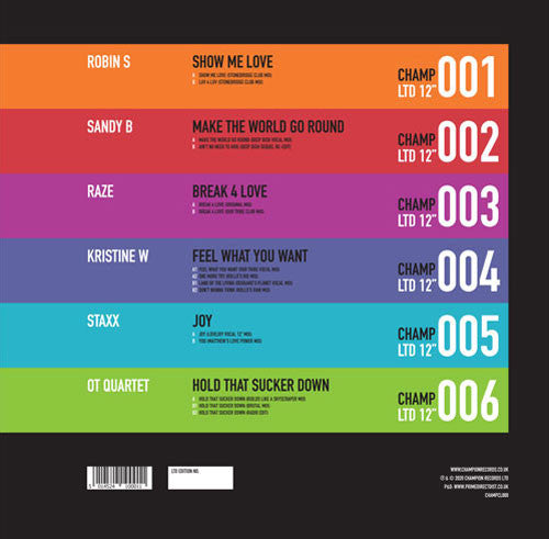 6 x 12" heavy weight vinyl boxset to celebrate 35 years of Champion Records featuring classics from the likes of Robin S, Raze, Kristine W, Staxx and OT Quartet housed in printed slipcase with spot UV, hand numbered and shrink wrapped.