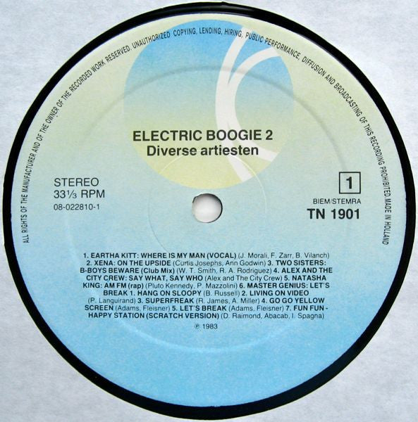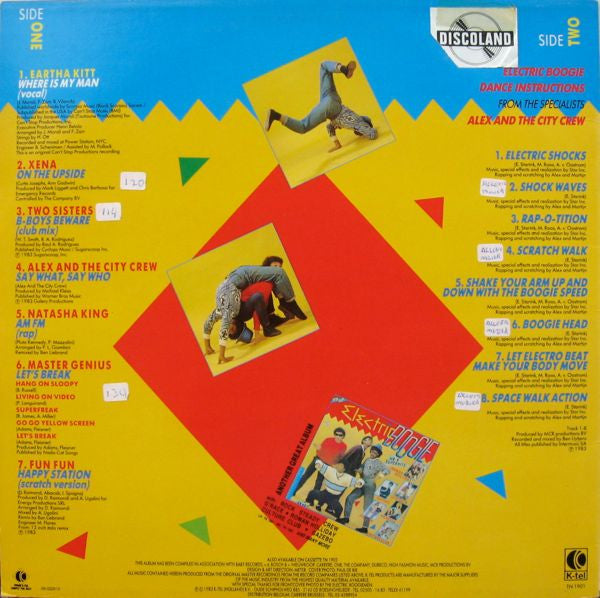 A1. Eartha Kitt - Where Is My Man (Vocal) 3:55 A2. Xena - On The Upside 3:36 A3. Two Sisters - B-Boys Beware (Club Mix) 5:52 A4. Alex And The City Crew - Say What, Say Who 3:04 A5. Natasha King - AM FM (Rap) 4:03 A6. Master Genius - Let's Break 3:35 A7. Fun Fun - Happy Station (Scratch Version) 3:16 B1. Alex And The City Crew - Electric Shocks 3:17 B2. Alex And The City Crew - Shock Waves 3:13 B3. Alex And The City Crew - Rap-O-Tition 3:20 B4. Alex And The City Crew - Scratch Walk 3:12 B5. Alex And The City Crew - Shake Your Arm Up And Down With The Boogie Beat 3:37 B6. Alex And The City Crew - Boogie Head 3:03 B7. Alex And The City Crew - Let Electro Beat Make Your Body Move 3:20 B8. Alex And The City Crew - Space Walk Action 3:20