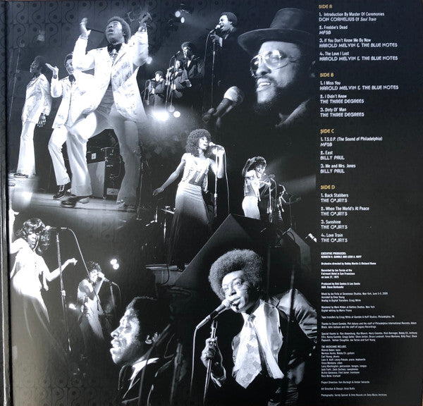 A1. Don Cornelius - Introduction By Master Of Ceremonies Don Cornelius Of Soul Train 1:35 A2. MFSB - Freddie's Dead 4:30 A3. Harold Melvin And The Blue Notes - If You Don't Know Me By Now 4:11 A4. Harold Melvin And The Blue Notes - The Love I Lost 5:05 B1. Harold Melvin And The Blue Notes - I Miss You 11:32 B2. The Three Degrees - I Didn't Know 2:52 B3. The Three Degrees - Dirty Ol' Man 4:31 C1. MFSB - T.S.O.P. (The Sound Of Philadelphia) Theme From Soul Train 2:31 C2. Billy Paul - East 10:21 C3. Billy Paul - Me And Mrs. Jones 8:34 D1. The O'Jays - Back Stabbers 4:41 D2. The O'Jays - When The World's At Peace 5:52 D3. The O'Jays - Sunshine 5:33 D4. The O'Jays - Love Train 3:37