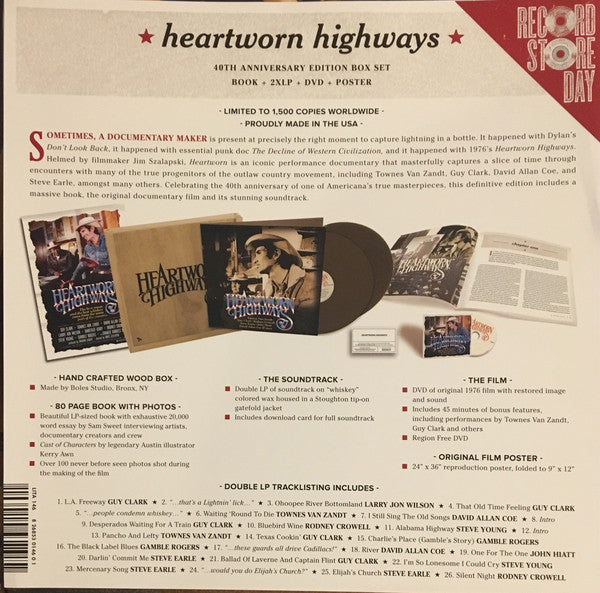 A1. Guy Clark - L.A. Freeway A2. No Artist - "...That's A Lightnin' Lick..." A3. Larry Jon Wilson - Ohoopee River Bottomland A4. Guy Clark - That Old Time Feeling A5. No Artist - "...People Condemn Whiskey..." A6. Townes Van Zandt - Waitin' 'Round To Die B1. David Allan Coe - I Still Sing The Old Songs B2. No Artist - Intro B3. Guy Clark - Desperados Waiting For A Train B4. Rodney Crowell - Bluebird Wine B5. Steve Young (2) - Alabama Highway C1. No Artist - Intro C2. Townes Van Zandt - Pancho And Lefty C3. Guy Clark - Texas Cookin' C4. Gamble Rogers - Charlie's Place (Gamble's Story) C5. Gamble Rogers - The Black Label Blues C6. No Artist - "...These Guards All Drive Cadillacs!" C7. David Allan Coe - River C8. John Hiatt - One For The Road D1. Steve Earle - Darlin' Commit Me D2. Guy Clark - Ballad Of Laverne And Captain Flint D3. Steve Young (2) - I'm So Lonesome I Could Cry D4. Steve Earle - Mercenary Song D5. No Artist - "...Would You Do Elijah's Church?" D6. Steve Earle - Elijah's Church D7. Rodney Crowell - Silent Night DVD-1. Various - Heartworn Highways 92:00 DVD-2. Various - Bonus Footage 61:00