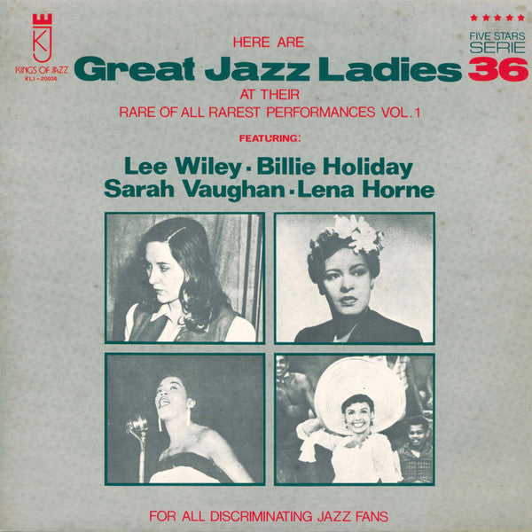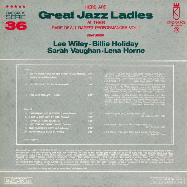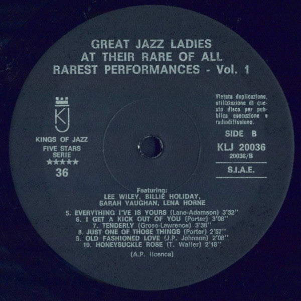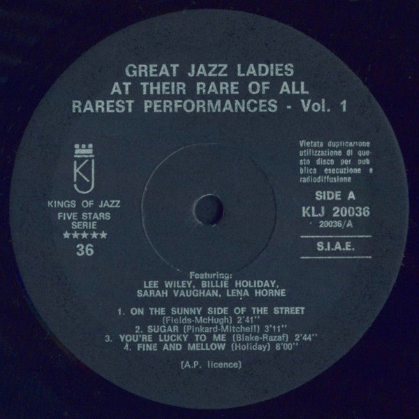 A1. Lee Wiley - On The Sunny Side Of The Street 2:41 A2. Lee Wiley - Sugar 3:11 A3. Lee Wiley - You're Lucky To Me 2:44 A4. Billie Holiday - Fine And Mellow 8:00 B1. Sarah Vaughan - Everything I Have Is Yours 3:32 B2. Sarah Vaughan - I Get A Kick Out Of You 3:08 B3. Sarah Vaughan - Tenderly 3:38 B4. Lena Horne - Just One Of Those Things 2:57 B5. Lena Horne - Old Fashioned Love 2:08 B6. Lena Horne - Honeysuckle Rose 2:18