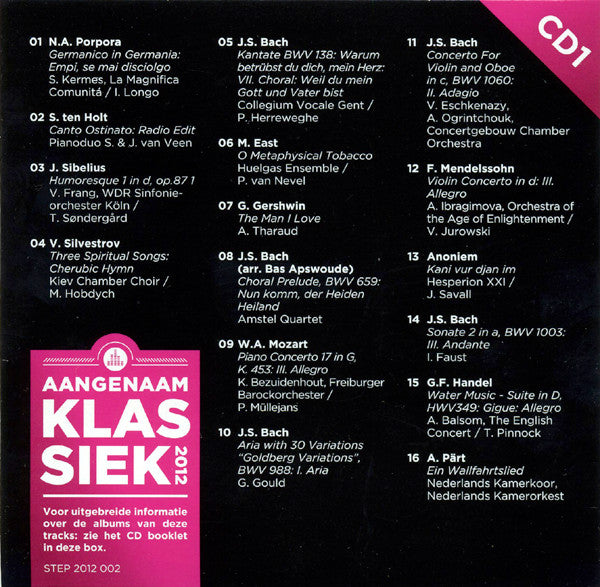 1-01. Simone Kermes, La Magnifica Comunità, Isabella Longo - Germanico In Germania: Empi, Se Mai Disciolgo 2:381-02. Piano Duo Sandra & Jeroen Van Veen - Canto Ostinato: Radio Edit 3:361-03. Vilde Frang, WDR Sinfonieorchester Köln, Thomas Søndergård - Humoresque 1 In D, Op.871 3:431-04. Kiev Chamber Choir, Mykola Hobdych - Three Spiritual Songs: Cherubic Hymn 4:001-05. Collegium Vocale, Philippe Herreweghe - Kantate BWV 138: Warum Betrübst Du Dich, Mein Herz: VII. Choral: Weil Du Mein Gott Und Vater Bist 1:591-06. Huelgas-Ensemble, Paul Van Nevel - O Metaphysical Tobacco 2:561-07. Alexandre Tharaud - The Man I Love 2:051-08. Amstel Quartet - Choral Prelude, BWV 659: Nun Komm, Der Heiden Heiland 5:091-09. Kristian Bezuidenhout, Freiburger Barockorchester, Petra Müllejans - Piano Concerto 17 In G, K. 453: III. Allegro 7:461-10. Glenn Gould - Aria With 30 Variations "Goldberg Variations", BWV 988: I. Aria 1:581-11. Vesko Eschkenazy, Alexei Ogrintchouk, Concertgebouw Chamber Orchestra - Concerto For Violin And Oboe In C, BWV 1060: II. Adagio 5:431-12. Alina Ibragimova, Orchestra Of The Age Of Enlightenment, Vladimir Jurowski - Violin Concerto In D: III. Allegro 4:021-13. Hespèrion XXI, Jordi Savall - Kani Vur Djan Im 3:551-14. Isabelle Faust - Sonate 2 In A, BWV 1003: III. Andante 4:101-15. Alison Balsom, English Concert, Trevor Pinnock - Water Music - Suite In D, HWV349: Gigue: Allegro 1:501-16. Nederlands Kamerkoor, Netherlands Chamber Orchestra - Ein Wallfahrtslied 8:422-01. West Kazakhstan Philharmonic Orchestra, Karl Jenkins - Requiem: Lux Aeterna 3:252-02. Han de Vries - Concerto For Oboe And Strings In C: Introduzione: Larghetto 2:542-03. Concerto Italiano, Rinaldo Alessandrini - Messa A Cinque Concertata: Gloria: I. Vivace: Gloria In Excelsis Deo & II. Largo: Et In Terra Pax 2:582-04. Quirine Viersen, Silke Avenhaus - Sonata For Cello And Piano: II. Adagio - Presto - Di Nuovo Adagio 4:122-05. Maria-João Pires, Orchestra Mozart, Claudio Abbado - Pianoconcert 27 In B Flat, K595: III. Allegro 8:472-06. Cinquecento - Missa Pro Defunctis "Requiem": II. Kyrie 3:452-07. Miloš Karadaglić, Studioorchester Der Europäischen FilmPhilharmonie, Christoph Israel - Quizás, Quizás, Quizás 3:142-08. Pierre-Laurent Aimard - Preludes Boek 1: VIII. La Fille Aux Cheveux De Lin 2:232-09. Bugge Wesseltoft, Henning Kraggerud - Last Spring (Based On E. Grieg) 5:542-10. Carel Kraayenhof, Sexteto Canyengue, Concertgebouw Chamber Orchestra, Ed Spanjaard - Maypa 3:122-11. The King's Singers - Mass For Four Voices: II. Gloria 5:532-12. Michael Riesman - Kundun (O.S.T.): Northern Tibet 3:232-13. Tijl Beckand, Rotterdams Philharmonisch Orkest, David Zinman - Het Sprookje Van Tsaar Saltan: Vlucht Van De Hommel 4:072-14. The Eric Whitacre Singers - Lux Aurumque (Light And Gold) 4:102-15. Johannette Zomer, The Gents (2) - Things Are Looking Up 3:362-16. Los Angeles Master Chorale, Grant Gershon - Miserere, Op.44: VI. Molto Lento 4:32. Bonus CD 3-1. Iris Hond - Pianoconcert Nr. 1 In E, Op.11 Voor Piano En Strijkkwintet: 1. Allegro Maestoso 17:423-2. Iris Hond - Pianoconcert Nr. 1 In E, Op.11 Voor Piano En Strijkkwintet: 2. Romance - Larghetto 9:203-3. Iris Hond - Pianoconcert Nr. 1 In E, Op.11 Voor Piano En Strijkkwintet: 3. Rondo - Vivace 10:10