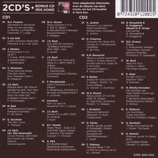 1-01. Simone Kermes, La Magnifica Comunità, Isabella Longo - Germanico In Germania: Empi, Se Mai Disciolgo 2:381-02. Piano Duo Sandra & Jeroen Van Veen - Canto Ostinato: Radio Edit 3:361-03. Vilde Frang, WDR Sinfonieorchester Köln, Thomas Søndergård - Humoresque 1 In D, Op.871 3:431-04. Kiev Chamber Choir, Mykola Hobdych - Three Spiritual Songs: Cherubic Hymn 4:001-05. Collegium Vocale, Philippe Herreweghe - Kantate BWV 138: Warum Betrübst Du Dich, Mein Herz: VII. Choral: Weil Du Mein Gott Und Vater Bist 1:591-06. Huelgas-Ensemble, Paul Van Nevel - O Metaphysical Tobacco 2:561-07. Alexandre Tharaud - The Man I Love 2:051-08. Amstel Quartet - Choral Prelude, BWV 659: Nun Komm, Der Heiden Heiland 5:091-09. Kristian Bezuidenhout, Freiburger Barockorchester, Petra Müllejans - Piano Concerto 17 In G, K. 453: III. Allegro 7:461-10. Glenn Gould - Aria With 30 Variations "Goldberg Variations", BWV 988: I. Aria 1:581-11. Vesko Eschkenazy, Alexei Ogrintchouk, Concertgebouw Chamber Orchestra - Concerto For Violin And Oboe In C, BWV 1060: II. Adagio 5:431-12. Alina Ibragimova, Orchestra Of The Age Of Enlightenment, Vladimir Jurowski - Violin Concerto In D: III. Allegro 4:021-13. Hespèrion XXI, Jordi Savall - Kani Vur Djan Im 3:551-14. Isabelle Faust - Sonate 2 In A, BWV 1003: III. Andante 4:101-15. Alison Balsom, English Concert, Trevor Pinnock - Water Music - Suite In D, HWV349: Gigue: Allegro 1:501-16. Nederlands Kamerkoor, Netherlands Chamber Orchestra - Ein Wallfahrtslied 8:422-01. West Kazakhstan Philharmonic Orchestra, Karl Jenkins - Requiem: Lux Aeterna 3:252-02. Han de Vries - Concerto For Oboe And Strings In C: Introduzione: Larghetto 2:542-03. Concerto Italiano, Rinaldo Alessandrini - Messa A Cinque Concertata: Gloria: I. Vivace: Gloria In Excelsis Deo & II. Largo: Et In Terra Pax 2:582-04. Quirine Viersen, Silke Avenhaus - Sonata For Cello And Piano: II. Adagio - Presto - Di Nuovo Adagio 4:122-05. Maria-João Pires, Orchestra Mozart, Claudio Abbado - Pianoconcert 27 In B Flat, K595: III. Allegro 8:472-06. Cinquecento - Missa Pro Defunctis "Requiem": II. Kyrie 3:452-07. Miloš Karadaglić, Studioorchester Der Europäischen FilmPhilharmonie, Christoph Israel - Quizás, Quizás, Quizás 3:142-08. Pierre-Laurent Aimard - Preludes Boek 1: VIII. La Fille Aux Cheveux De Lin 2:232-09. Bugge Wesseltoft, Henning Kraggerud - Last Spring (Based On E. Grieg) 5:542-10. Carel Kraayenhof, Sexteto Canyengue, Concertgebouw Chamber Orchestra, Ed Spanjaard - Maypa 3:122-11. The King's Singers - Mass For Four Voices: II. Gloria 5:532-12. Michael Riesman - Kundun (O.S.T.): Northern Tibet 3:232-13. Tijl Beckand, Rotterdams Philharmonisch Orkest, David Zinman - Het Sprookje Van Tsaar Saltan: Vlucht Van De Hommel 4:072-14. The Eric Whitacre Singers - Lux Aurumque (Light And Gold) 4:102-15. Johannette Zomer, The Gents (2) - Things Are Looking Up 3:362-16. Los Angeles Master Chorale, Grant Gershon - Miserere, Op.44: VI. Molto Lento 4:32. Bonus CD 3-1. Iris Hond - Pianoconcert Nr. 1 In E, Op.11 Voor Piano En Strijkkwintet: 1. Allegro Maestoso 17:423-2. Iris Hond - Pianoconcert Nr. 1 In E, Op.11 Voor Piano En Strijkkwintet: 2. Romance - Larghetto 9:203-3. Iris Hond - Pianoconcert Nr. 1 In E, Op.11 Voor Piano En Strijkkwintet: 3. Rondo - Vivace 10:10