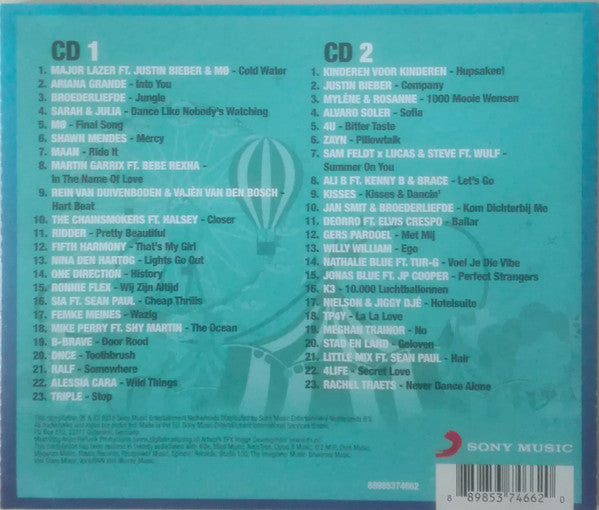 1-1. Major Lazer, Justin Bieber, MØ - Cold Water 1-2. Ariana Grande - Into You 1-3. Broederliefde - Jungle 1-4. Sarah & Julia - Dance Like Nobody's Watching 1-5. MØ - Final Song 1-6. Shawn Mendes - Mercy 1-7. Maan (4) - Ride It 1-8. Martin Garrix, Bebe Rexha - In The Name Of Love 1-9. Rein van Duivenboden, Vajèn van den Bosch - Hart Beat 1-10. The Chainsmokers, Halsey - Closer 1-11. Ridder van Kooten - Pretty Beautiful 1-12. Fifth Harmony - That's My Girl 1-13. Nina Den Hartog - Lights Go Out 1-14. One Direction - History 1-15. Ronnie Flex (2) - Wij Zijn Altijd 1-16. Sia, Sean Paul - Cheap Thrills 1-17. Femke Meines - Wazig 1-18. Mike Perry (2), Shy Martin - The Ocean 1-19. B-Brave - Door Rood 1-20. DNCE - Toothbrush 1-21. Ralf (18) - Somewhere 1-22. Alessia Cara - Wild Things 1-23. Triple (7) - Stop 2-1. Kinderen voor Kinderen - Hupsakee! 2-2. Justin Bieber - Company 2-3. Mylène & Rosanne - 1000 Mooie Wensen 2-4. Alvaro Soler - Sofia 2-5. 4U (13) - Bitter Taste 2-6. ZAYN (3) - Pillowtalk 2-7. Sam Feldt, Lucas & Steve, Wulf (12) - Summer On You 2-8. Ali B (2), Kenny B (5), Brace (2) - Let's Go 2-9. Kisses (4) - Kisses & Dancin' 2-10. Jan Smit, Broederliefde - Kom Dichterbij Me 2-11. Deorro, Elvis Crespo - Bailar 2-12. Gers Pardoel - Met Mij 2-13. Willy William - Ego 2-14. Nathalie Blue (2), Tur-G - Voel Je Die Vibe 2-15. Jonas Blue, JP Cooper - Perfect Strangers 2-16. K3 - 10.000 Luchtballonnen 2-17. Nielson, Jiggy Djé - Hotelsuite 2-18. TP4Y - La La Love 2-19. Meghan Trainor - No 2-20. Stad en Land - Geloven 2-21. Little Mix, Sean Paul - Hair 2-22. 4LIFE (2) - Secret Love 2-23. Rachel Traets - Never Dance Alone