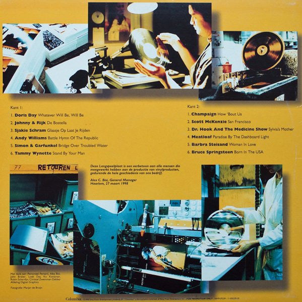 A1. Doris Day - Whatever Will Be, Will Be 2:03 A2. Johnny & Rijk - De Bostella 2:45 A3. Sjakie Schram - Glaasje Op Laat Je Rijden 2:45 A4. Andy Williams - Battle Hymn Of The Republic 3:28 A5. Simon & Garfunkel - Bridge Over Troubled Water 4:52 A6. Tammy Wynette - Stand By Your Man 2:39 B1. Champaign - How 'Bout Us 4:07 B2. Scott McKenzie - San Francisco 2:58 B3. Dr. Hook & The Medicine Show - Sylvia's Mother 3:49 B4. Meat Loaf - Paradise By The Dashboard Light 8:28 B5. Barbra Streisand - Woman In Love 3:53 B6. Bruce Springsteen - Born In The USA 4:39