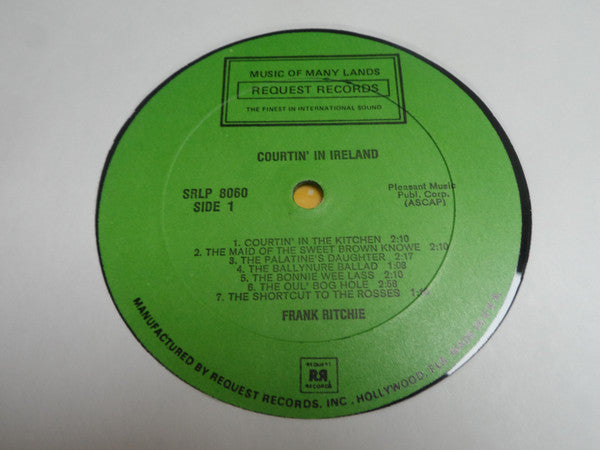 A1. Frank Ritchie - Courtin' In The Kitchen 2:10 A2. Frank Ritchie - The Maid Of The Sweet Brown Knowe 2:10 A3. Frank Ritchie - The Palatine's Daughter 2:17 A4. Frank Ritchie - The Ballynure Ballad 1:08 A5. Frank Ritchie - The Bonnie Wee Lass 2:10 A6. Frank Ritchie - The Oul' Bog Hole 2:58 A7. Frank Ritchie - The Shortcut To The Rosses 1:10 B1. Frank Ritchie - Stutterin' Lovers 1:30 B2. Frank Ritchie - Must I Go Bound? 1:15 B3. Frank Ritchie - Kitty Of Coloraine 1:03 B4. Frank Ritchie - I Gave My Love A Cherry 1:23 B5. Frank Ritchie - The Spinning Wheel 2:48 B6. Frank Ritchie - The Oul' Llamas Fair 2:25 B7. Frank Ritchie - "Thank Ye' Mam" Says Dan 1:58 . Ceili Time In Ireland C1. Emerald Ceili Band, McClusker Brothers, The Ardellis Ceili Band - Emerald Marches: Ceili Band / Bridge Of Toom / God Save Ireland / The Boys Of Wexford 3:23 C2. Emerald Ceili Band, McClusker Brothers, The Ardellis Ceili Band - Reels: Paddy On The Railroad / Miss Monaghan / Soldiers Joy 3:15 C3. Emerald Ceili Band, McClusker Brothers, The Ardellis Ceili Band - Hornpipe: Showman's Fancy / Murhpy's 2:58 C4. Emerald Ceili Band, McClusker Brothers, The Ardellis Ceili Band - Reels: George White's Favourite / Roaring Mary / The Woman Of The House / Bonny Kate 4:25 D1. Emerald Ceili Band, McClusker Brothers, The Ardellis Ceili Band - Ardilles Waltzes: Rose Of Arranmore / Off In The Stilly Night / Castle Of Dromore 4:15 D2. Emerald Ceili Band, McClusker Brothers, The Ardellis Ceili Band - Hornpipe: Reiska Hornpipe / Boys Of Bluebell 2:06 D3. Emerald Ceili Band, McClusker Brothers, The Ardellis Ceili Band - McCusker Jigs: Lark Of The Strand / Lark Of The Strand / Rose In The Garden 2:06 D4. Emerald Ceili Band, McClusker Brothers, The Ardellis Ceili Band - Jigs: The Idle Road / Knights Of St. Patrick 2:04 D5. Emerald Ceili Band, McClusker Brothers, The Ardellis Ceili Band - Waltzes: Shawl Of Galway Grey 2:30