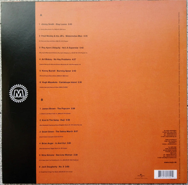 A1. Jimmy Smith - Stay Loose 3:45 A2. Fred Wesley & The JB's - Watermelon Man 3:35 A3. Roy Ayers Ubiquity - He's A Superstar 5:42 A4. Art Blakey - No Hay Problema 4:27 A5. Kenny Burrell - Burning Spear 2:42 A6. Hugh Masekela - Cantaloupe Island 5:30 B1. James Brown - The Popcorn 2:58 B2. Kool & The Gang - Dujii 5:56 B3. Grant Green - The Selma March 8:07 B4. Brian Auger - In And Out 3:00 B5. Nina Simone - See Line Woman 2:30 B6. Jack Daugherty - No. 9 3:00