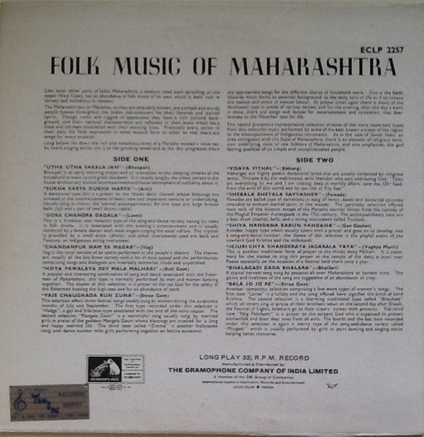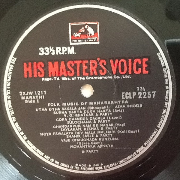 A1. Asha Bhosle - Utha Utha Sakala Jan (Bhoopali) A2. V. G. Bhatkar, "Folk Music Of Maharashtra" Party - Sukha Karta Dukha Harta (Arti) A3. Sulochana (2), "Folk Music Of Maharashtra" Party - Gora Chandra Dagala (Lavni) A4. Savlaram, Keshar, "Folk Music Of Maharashtra" Party - Chandanpur Nam Ek Nagar (Vag) A5. Shahir Sable, "Folk Music Of Maharashtra" Party - Hoya Pawalaya Dev Mala Malhari (Koli Geet) A6. Mohantara Ajinkya, "Folk Music Of Maharashtra" Party - Vaje Chaughada Run Zuna (Stree Geet) B1. V. G. Bhatkar, "Folk Music Of Maharashtra" Party - Visava Vithal (Abhang) B2. Shahir Piraji Sarnaik, "Folk Music Of Maharashtra" Party - Sherala Bhetala Savvasher (Powada) B3. Savlaram, Keshar, "Folk Music Of Maharashtra" Party - Shiva Nandana Karun Vandana (Gan Gaulan) B4. Shahir Sable, "Folk Music Of Maharashtra" Party - Jejuri Chya Khanderaya Jagarala Yaya (Vaghya Murli) B5. Shahir Pundlik Farande, "Folk Music Of Maharashtra" Party - Bhalagadi Dada Bhalara (Bhallari) B6. Mohantara Ajinkya, "Folk Music Of Maharashtra" Party - Bala Jo Jo Re (Stree Geet)