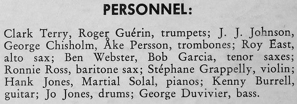 4th and final session on July 3 in Paris (additions to the tape) with Roger Guerin, Bob Garcia, Martial Solal, Stephane Grapelli. The European contributors heard the tape in full hi-fi conditions via loudspeakers and were recorded with this background.