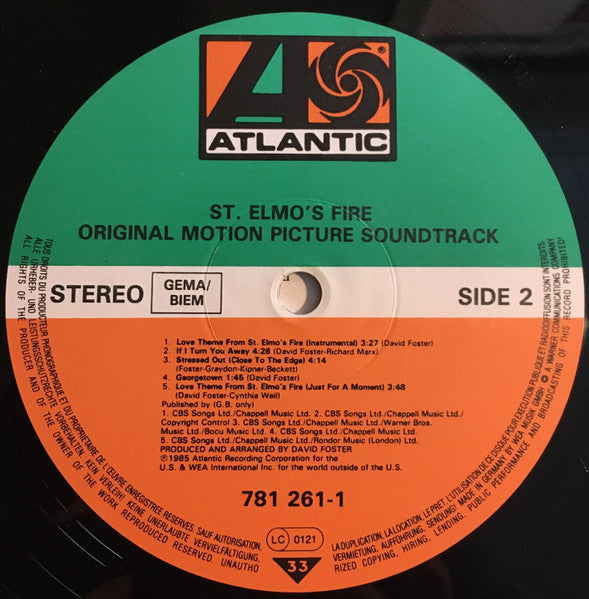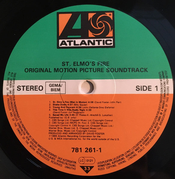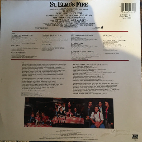 A1. John Parr - St. Elmo's Fire (Man In Motion) 4:08 A2. Billy Squier - Shake Down 4:07 A3. Elefante - Young And Innocent 4:34 A4. Jon Anderson - This Time It Was Really Right 4:39 A5. Fee Waybill - Saved My Life 3:45 B1. David Foster - Love Theme From St. Elmo's Fire (Instrumental) 3:27 B2. Vicki Moss - If I Turn You Away 4:28 B3. Airplay (4) - Stressed Out (Close To The Edge) 4:14 B4. David Foster - Georgetown 1:45 B5. David Foster - Love Theme From St. Elmo's Fire (Just For A Moment) 3:48