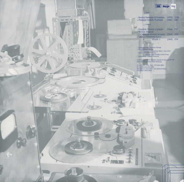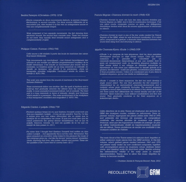 A1. Beatriz Ferreyra - L’Orvietan 12:58 A2. Philippe Carson - Turmac 9:45 B1. Edgardo Cantón - I Palpiti 7:59 B2. Francis Régnier - Chemins D'avant La Mort 4:20 B3. Mireille Kyrou - Etude 1 5:09