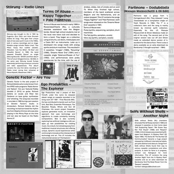 A1. Störung - Radio Lines 3:34 A2. Genetic Factor - Are You 3:22 A3. Ego Produkties - The Explorer (Instrumental) 3:24 A4. Parlinone - Dodubdada (Maoupa Mazzochetti & Oli Edit) 4:10 A5. Selfs Without Shells - Another Screen 2:43 A6. Terms Of Abuse - Happy Together 2:43 A7. Terms Of Abuse - Pale Paintress 2:55 B1. La Strada - Neuroduplication 4:56 B2. Single Handed - This Morning Carousel 4:23 B3. T. Toeloeze - Science Fiction 4:41 B4. King Koen - Erika 3:54 B5. Gradual Isolation - The Sky Converts 3:22 B6. Gradual Isolation - Agony By Men 2:48