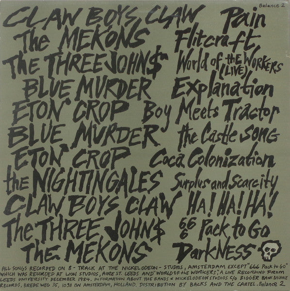 All songs recorded on 8-track at the Nickelodeon Studios, Amsterdam, except B5 which was recorded at Lion Studios, Aire St. Leeds and A3, a live recording from Leeds University December 1984.