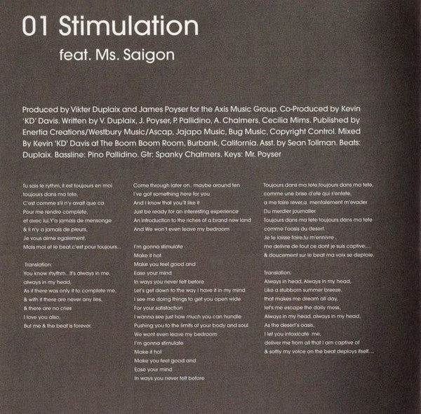 1. Stimulation 3:452. Make A Baby 6:393. The Way That I Feel 5:044. I See The Sun 5:225. A Life Worth Living 5:456. Another Great Love Gone By 4:327. Fade It 4:488. For Life 5:509. In The Middle Of You 7:1010. Nothing Like Your Touch 3:4411. Pure 4:0712. Temple Of Thoughts 7:27