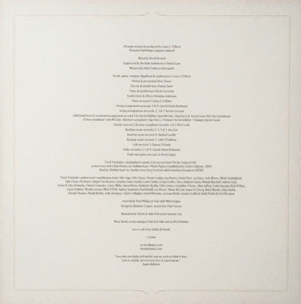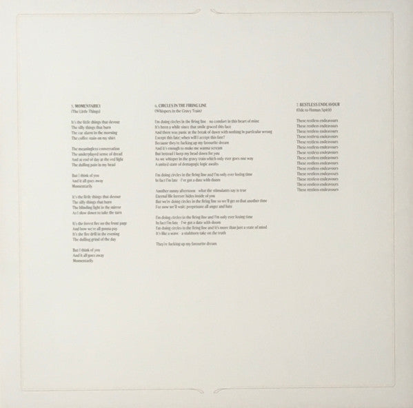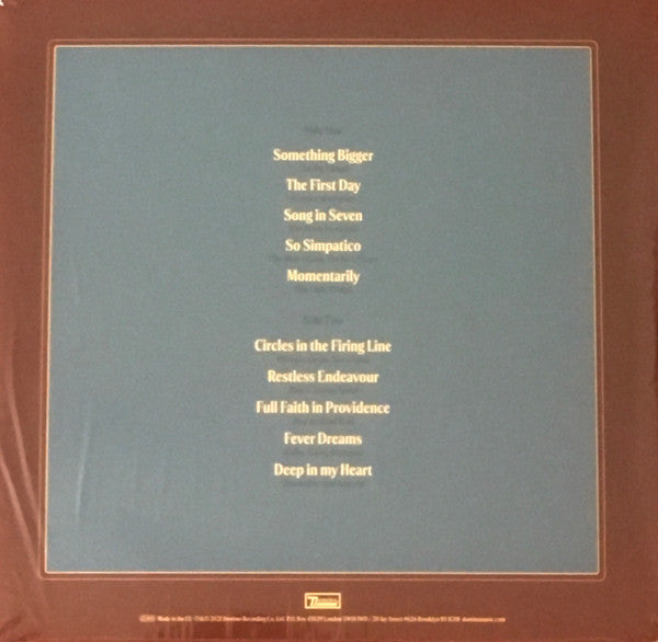 A1. Something Bigger (The Big Things) 0:47 A2. The First Day (Essence Of A Dream) 4:10 A3. Song In Seven (The Warm North Sea) 4:04 A4. So Simpatico (The More I Know, The More I Care) 7:02 A5. Momentarily (The Little Things) 5:30 B1. Circles In The Firing Line (Whispers In The Gravy Train) 6:33 B2. Restless Endeavor (Ode To Human Spirit) 3:03 B3. Full Faith In Providence (May The Road Rise) 3:49 B4. Fever Dream (Going, Going, Heptagon) 6:01 B5. Deep In My Heart (Moonshine Soul Remedy) 4:19