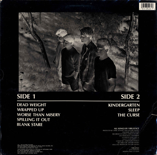 Included a plain black inner sleeve, with "PRINTED IN U.S.A." and underneath that "ALCHEMY 003 LP" in small white print bottom centre on one side.