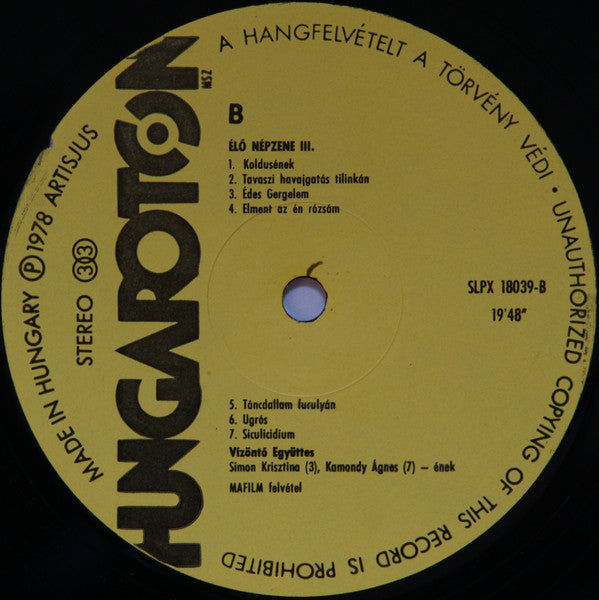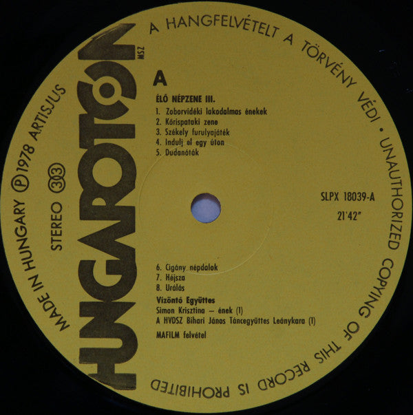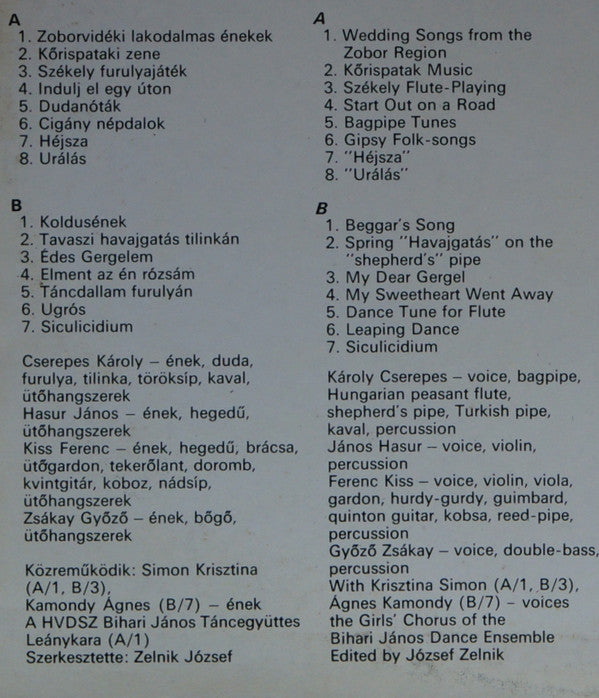 A1. Zomborvidéki Lakodalmas Ének = Wedding Song From The Zombor Region 4:12 A2. Kőrispataki Zene = Kőrispataki Music 4:20 A3. Székely Furulyajáték = Székely Flute-Playing 1:00 A4. Indulj El Egy Úton = Start Out On A Road 2:54 A5. Dudanóták = Bagpipe Tunes 1:56 A6. Cigány Népdalok = Gypsy Folk-Songs 1:05 A7. Héjsza 2:33 A8. Urálás 3:42 B1. Koldusének = Beggar's Song 3:30 B2. Tavaszi Havajgatás Tilinkán = Spring "Havajgatás" On The "Shepherd's" Pipe 0:55 B3. Édes Gergelem = My Dear Gergel 1:30 B4. Elment Az Én Rózsám = My Sweetheart Went Away 3:08 B5. Táncdallam Furulyán = Dance Tune For Flute 0:45 B6. Ugrós = Leaping Dance 3:18 B7. Siculicidium 6:42