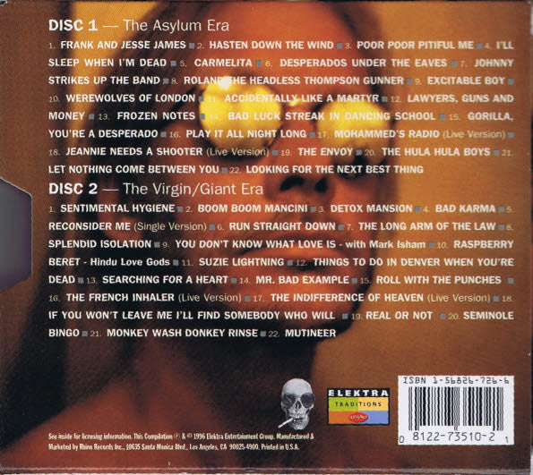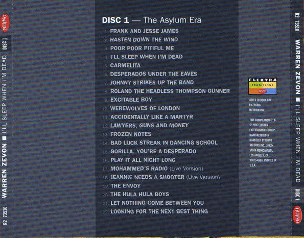 . The Asylum Era 1-1. Warren Zevon - Frank And Jesse James 4:361-2. Warren Zevon, The Sid Sharp Strings - Hasten Down The Wind 3:011-3. Warren Zevon - Poor Poor Pitiful Me 3:061-4. Warren Zevon - I'll Sleep When I'm Dead 2:581-5. Warren Zevon - Carmelita 3:351-6. Warren Zevon, The Sid Sharp Strings - Desperados Under The Eaves 4:471-7. Warren Zevon - Johnny Strikes Up The Band 2:491-8. Warren Zevon, The Gentlemen Boys - Roland The Headless Thompson Gunner 3:451-9. Warren Zevon - Excitable Boy 2:411-10. Warren Zevon - Werewolves Of London 3:281-11. Warren Zevon, The Gentlemen Boys - Accidentally Like A Martyr 3:381-12. Warren Zevon - Lawyers, Guns And Money 3:321-13. Warren Zevon - Frozen Notes 2:011-14. Warren Zevon, The Sid Sharp Strings - Bad Luck Streak In Dancing School 2:591-15. Warren Zevon - Gorilla, You're A Desperado 2:471-16. Warren Zevon, The Sid Sharp Strings - Play It All Night Long 3:181-17. Warren Zevon - Mohammed's Radio (Live Version) 4:491-18. Warren Zevon - Jeannie Needs A Shooter (Live Version) 4:071-19. Warren Zevon - The Envoy 3:131-20. Warren Zevon - The Hula Hula Boys 3:021-21. Warren Zevon - Let Nothing Come Between You 3:391-22. Warren Zevon - Looking For The Next Best Thing 3:38. The Virgin-Giant Era 2-1. Warren Zevon - Sentimental Hygiene 5:032-2. Warren Zevon - Boom Boom Mancini 4:492-3. Warren Zevon - Detox Mansion 3:132-4. Warren Zevon - Bad Karma 3:132-5. Warren Zevon - Reconsider Me (Single Version) 3:262-6. Warren Zevon - Run Straight Down 4:062-7. Warren Zevon - The Long Arm Of The Law 3:462-8. Warren Zevon - Splendid Isolation 4:302-9. Warren Zevon, Mark Isham - You Don't Know What Love Is 2:302-10. Hindu Love Gods - Raspberry Beret 3:542-11. Warren Zevon - Suzie Lightning 4:052-12. Warren Zevon - Things To Do In Denver When You're Dead 2:532-13. Warren Zevon - Searching For A Heart 4:182-14. Warren Zevon - Mr. Bad Example 3:222-15. Warren Zevon - Roll With The Punches 2:242-16. Warren Zevon - The French Inhaler (Live Version) 4:212-17. Warren Zevon - The Indifference Of Heaven (Live Version) 4:142-18. Warren Zevon - If You Won't Leave Me I'll Find Somebody Who Will 0:432-19. Warren Zevon - Real Or Not 1:452-20. Warren Zevon - Seminole Bingo 3:122-21. Warren Zevon - Monkey Wash Donkey Rinse 3:552-22. Warren Zevon - Mutineer 3:17