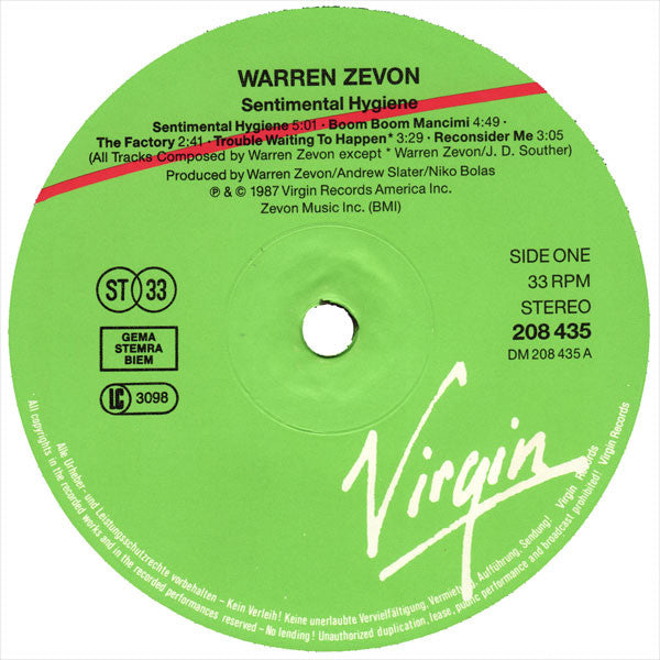 Phonographic Copyright (p) Virgin Records America, Inc. Copyright (c) Virgin Records America, Inc. Recorded At Record One, Los Angeles Recorded At A&M Studios Recorded At Cheshire Sound Studios Mixed At A&M Studios Mixed At Ground Control Studios Mixed At Record Plant, Los Angeles Mastered At Precision Lacquer Pressed By Sonopress Printed By TOPAC Published By Zevon Music Inc. Published By Chappell Music
