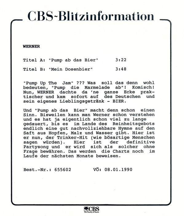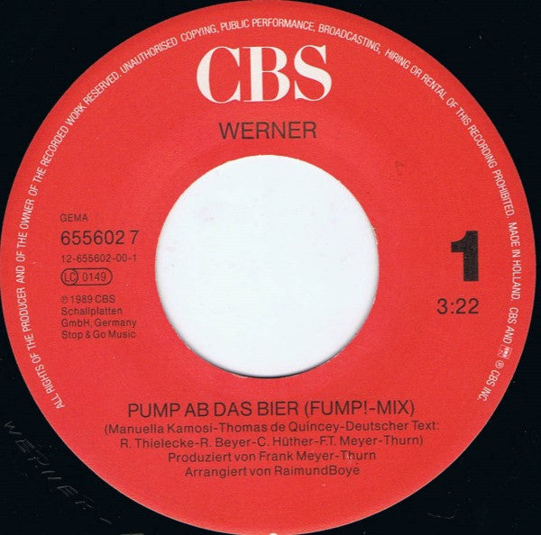 Edition with red CBS centre labels; artist featured as 'Werner'. Also released with 'CBS Dance Pool'-labels and similar sleeve artwork, credited to 'Werner Wichtig'.