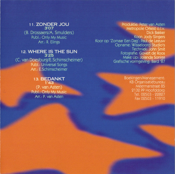 1. Waar Is De Zon 3:252. Champagne 3:003. Dromen 3:134. Zomaar Een Dag 2:445. Ik Hou Zoveel Van Jou 3:156. Net Alsof Er Niets Gebeurd Is 3:087. Tussen Jou En Mij 2:588. Laat Ons Dansen 3:069. Deja Vu 3:0810. Jij 3:0411. Zonder Jou 3:0712. Where Is The Sun 3:2513. Bedankt 1:43