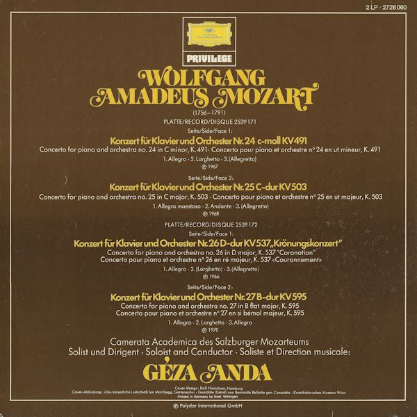 . Konzert Für Klavier Und Orchester Nr. 24 C-Moll KV 491 = Concerto For Piano And Orchestra No. 24 In C Minor, K. 491 = Concerto Pour Piano Et Orchestra No 24 En Ut Mineur, K. 491 . Konzert Für Klavier Und Orchester Nr. 25 C-Durl KV 503 = Concerto For Piano And Orchestra No. 25 In C Major, K. 503 = Concerto Pour Piano Et Orchestra No 25 En Ut Majeur, K. 503 . Konzert Für Klavier Und Orchester Nr. 26 D-Dur KV 537 „Kröningskonzert" = Concerto For Piano And Orchestra No. 26 In D Major, K. 537 "Coronation" = Concerto Pour Piano Et Orchestra No 26 En Ré Majeur, K. 537 «Couronnement» . Konzert Für Klavier Und Orchester Nr. 27 B-Dur KV 595 = Concerto For Piano And Orchestra No. 27 In B Flat Major, K. 595 = Concerto Pour Piano Et Orchestra No 27 En Si Bémol Majeur, K. 595