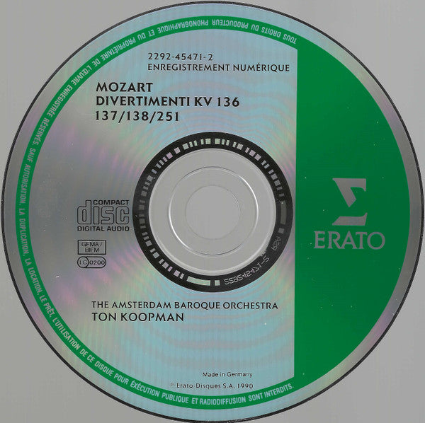 . Divertimento KV 136 En Ré Majeur / D Major / D-dur 18:30. Divertimento KV 137 En Si Bémol Majeur / B Flat Major / B-dur 12:33. Divertimento KV 138 En Fa Majeur / F Major / F-dur 13:43. Divertimento KV 251 En Ré Majeur / D Major / D-dur 27:20
